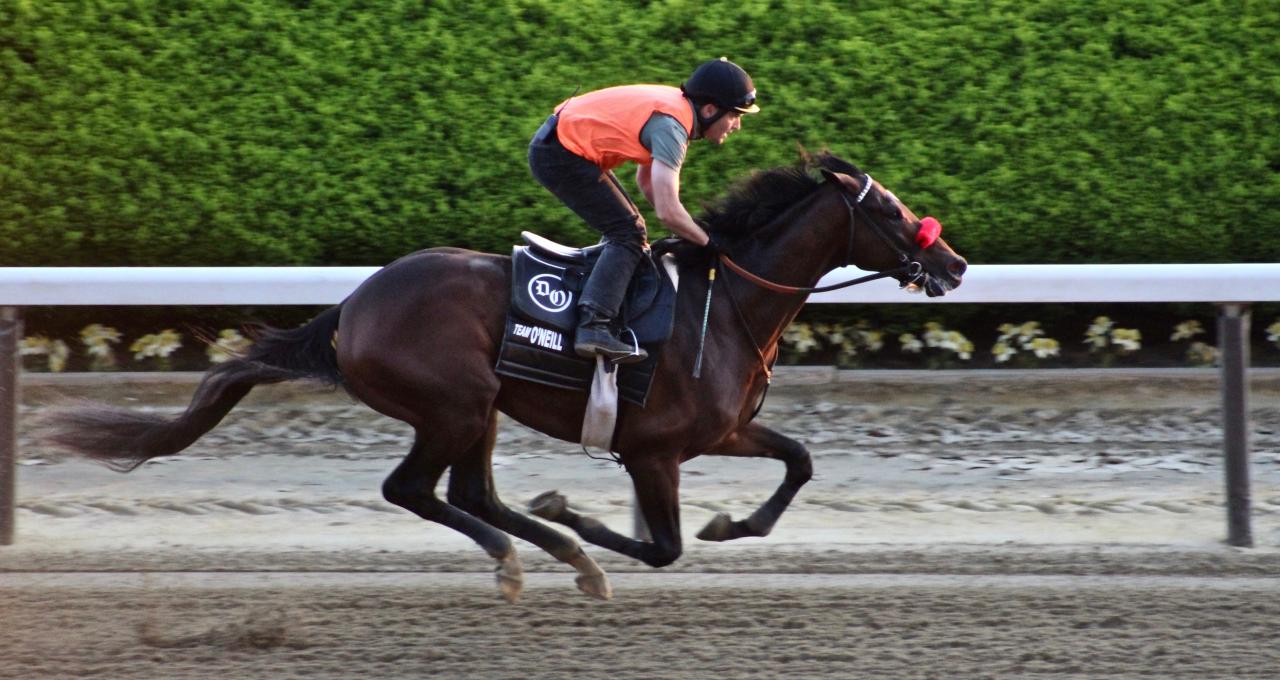 The 3-year-old took to the track at 5:45 a.m., and was allowed to stand and take in the massive course before he went about his work regimen. O’Neill said the work was timed with splits of 12 3/5 and 25 for the first quarter, and galloped out five furlongs in 1:00 and six furlongs in 1:13.
